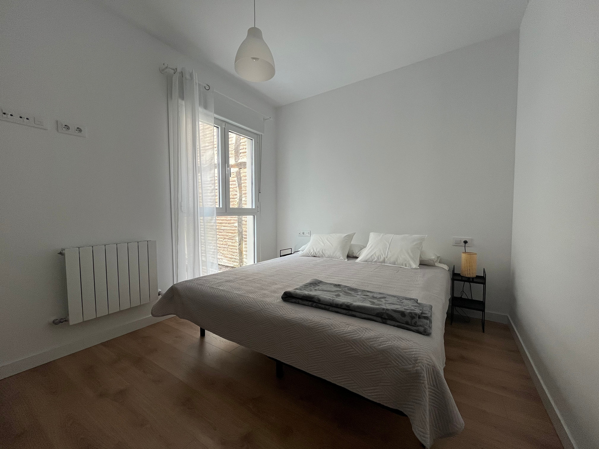 This bright bedroom on the top floor overlooks a peaceful, internal patio, ensuring abundant natural light.